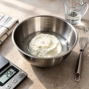 150 ml Wasser mit 250 g. Quark in eine Schüssel geben und gut verrühren