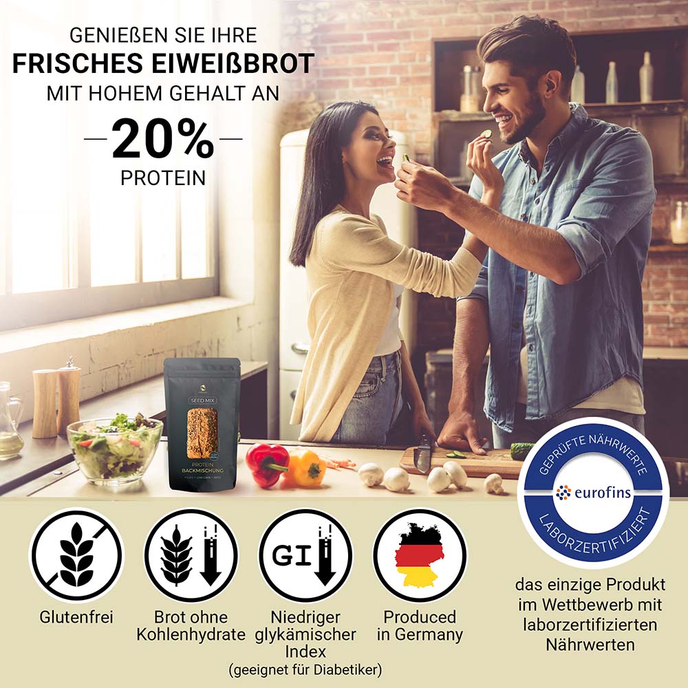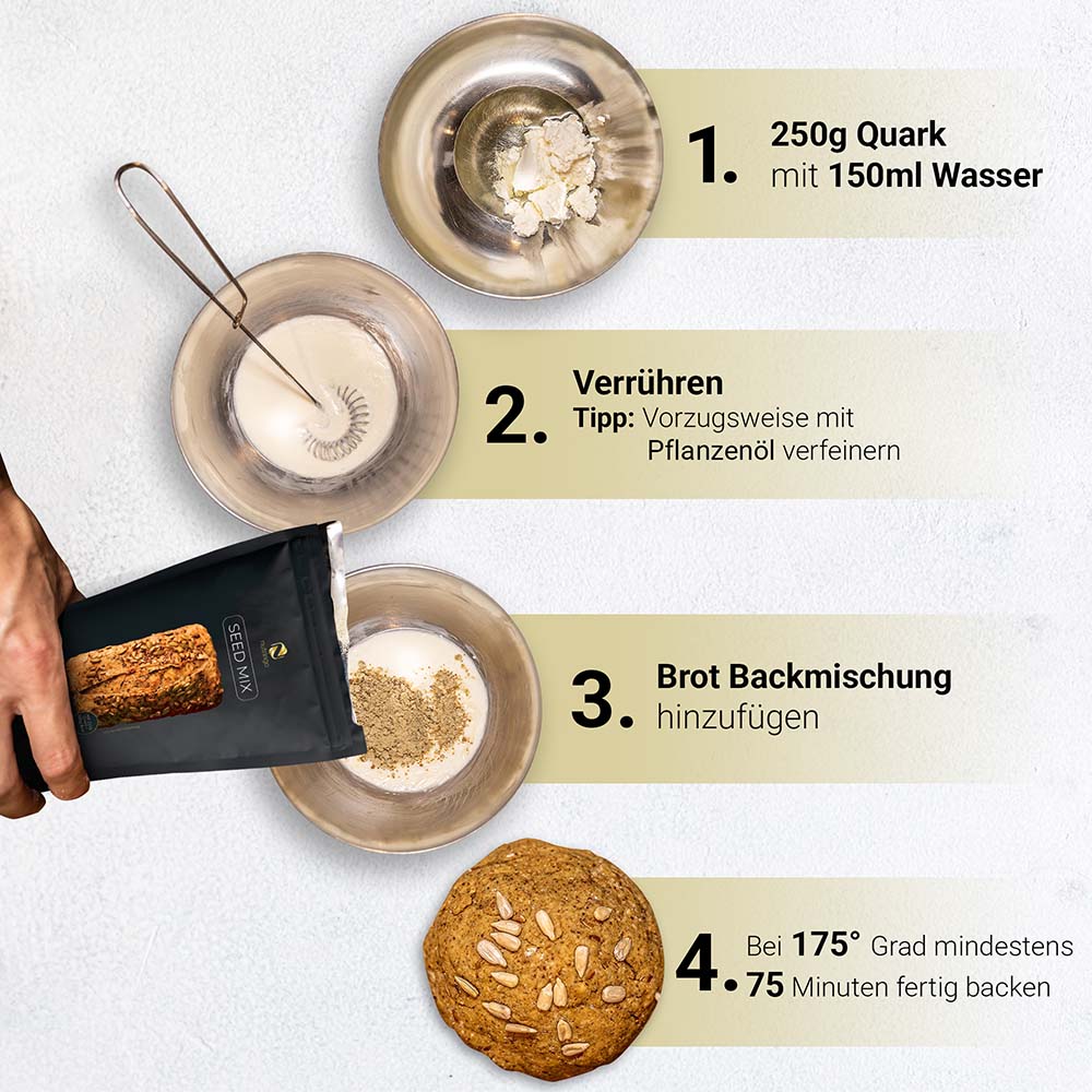 Now bake a fresh protein bread every day with only 4g of carbohydrates. Simply add 250g of quark and enjoy one of the most digestible breads.