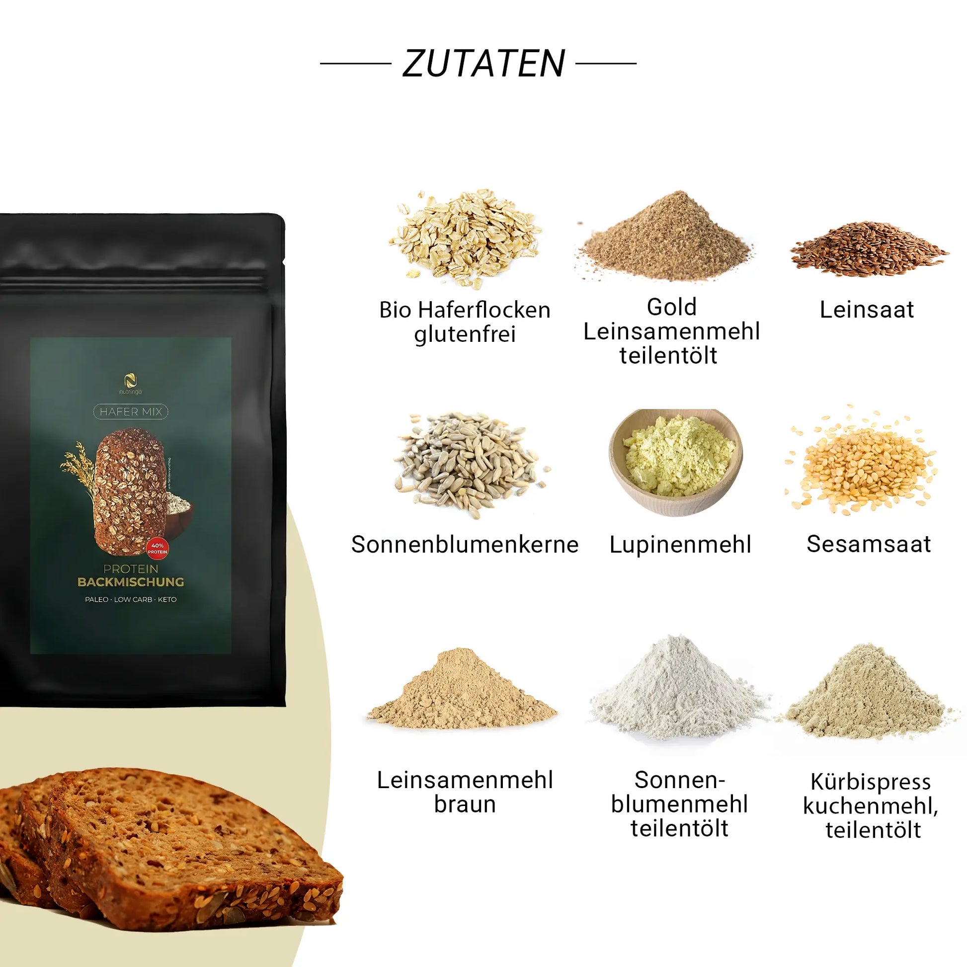 Du suchst ein Brot, das satt macht, wenig Kohlenhydrate hat und trotzdem schmeckt wie echtes Brot? Dann ist unser Hafermix genau dein Ding. Die Kombination aus Bio-Haferflocken und hochwertigen Saaten liefert dir ein saftiges, kerniges Brot – perfekt geeignet für Low Carb, Keto, Paleo und alle, die weniger Zucker essen wollen.