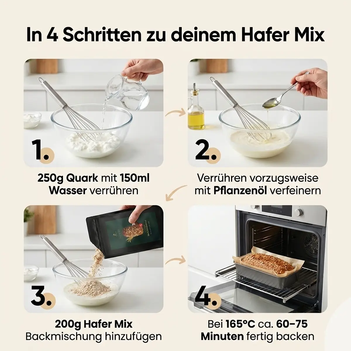 250 g. Quark sowie 150 ml Wasser sowie 50 ml Olivenoel in eine Schuessel geben.